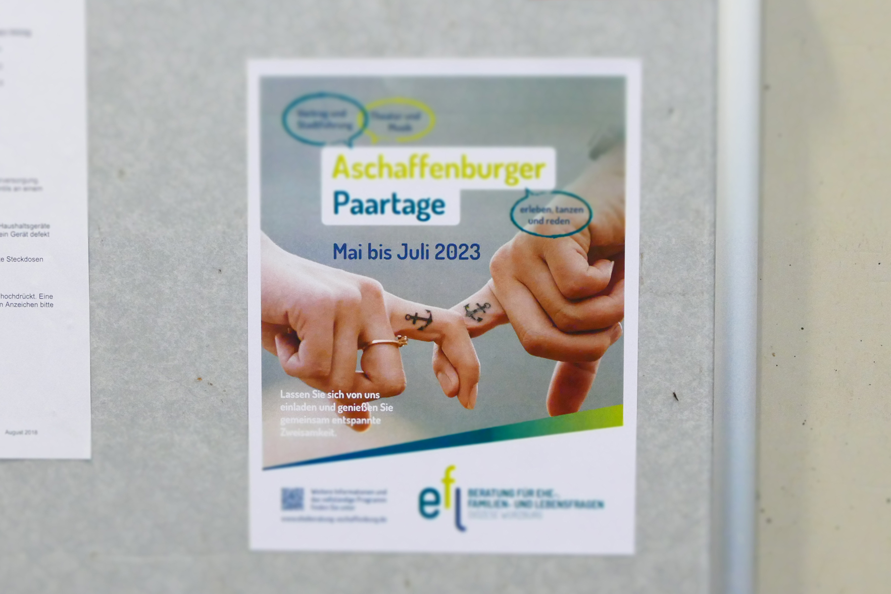 Aschaffenburg (POW) Zum zweiten Mal nach 2016 veranstaltet die Aschaffenburger Beratungsstelle für Ehe-, Lebens- und Familienfragen (EFL) in diesem Jahr die „Aschaffenburger Paartage“. Zwischen Mai und Juli 2023 lädt das Team zu 14 sehr unterschiedlichen Veranstaltungen ein. Das Spektrum reicht vom klassischen Vortrag über einen Tanzworkshop, einen Kochkurs, einen Outdoorparcours oder Stadtführungen bis zur Alpaka-Wandertour für Paare. Viele der Veranstaltungen finden direkt in Aschaffenburg statt, aber auch Miltenberg, Alzenau, Hobbach und das Hafenlohrtal stehen mit auf der Liste, und an einem Abend zu Patchworkfamilien kann man auch online teilnehmen.