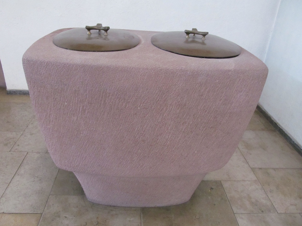 Die beiden Becken auf der Südostseite, in einen einzigen Stein integriert, überraschen allerdings vor allem der Dopplung, die meines Wissens einmalig in der Gestaltung von Taufbecken ist. Wozu zwei Taufbecken? Eines würde doch genügen! Sie geben uns zu denken und lassen Fragen offen: Erinnern sie symbolisch an die beiden Kirchenpatrone Petrus und Paulus, die beide selbst getauft haben? Oder an Amt und Lehre als künftige Wegweisung für den Getauften? Oder an die Dualität menschlichen Lebens, die Christus zur Einheit führen möchte?