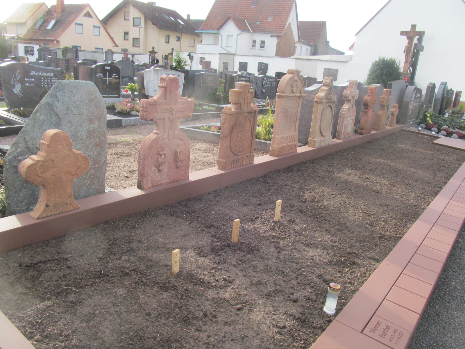 Neun allesamt sehenswerte historische Grabsteine aus dem 18. und 19. Jahrhundert reihen sich dort in zehn Metern Länge dicht aneinander. Ihnen vorgelagert ist ein Erdstreifen für 30 Urnengräber. In der Morgensonne fällt der Schatten der Steine mit ihrer symbolischen Bildaussage über die Urnengräber: Ewigkeit im Bild der Steine triff die Zeitlichkeit in den Urnengräbern. Das könnte schon alles an Information sein, wäre da nicht gleichzeitig die Beschäftigung mit der Quantenphysik und ihren fundamentalen Aussagen über Zeit und Ewigkeit, wie sie etwa von H.P. Dürr, Niels Bohr, Einstein, Pauli. formuliert haben.