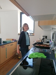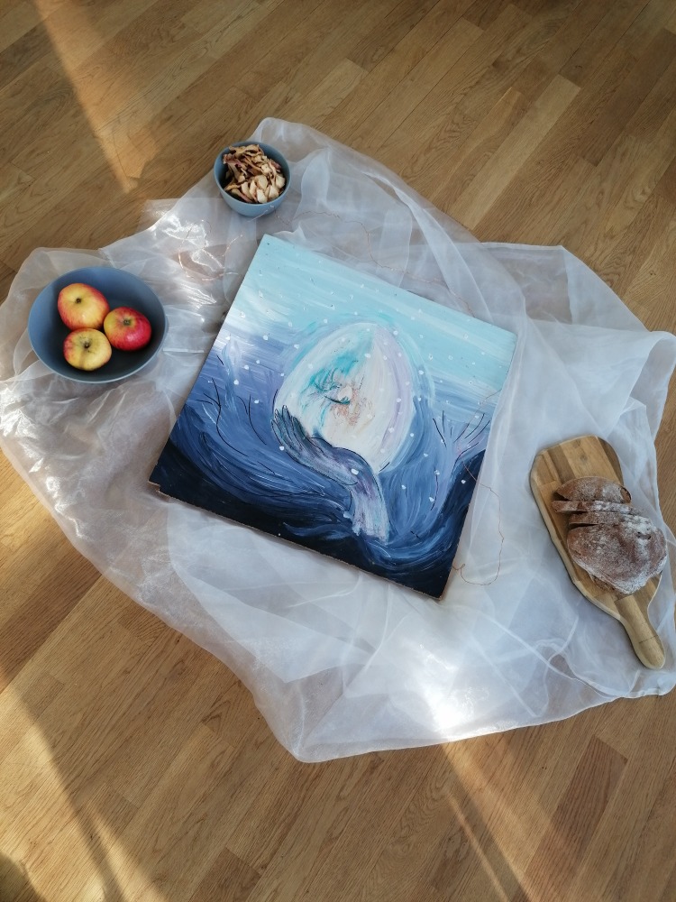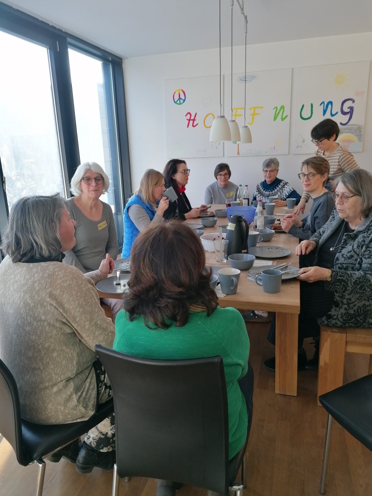In der KJA-Wohnung im Martinushaus war es beinahe so märchenhaft, magisch und heimelig wie bei Frau Holle selbst. Nachdem die Frauen an einem Spinnrad vorbei in die Tiefe steigen mussten, konnten sie am Brunnen im Foyer über ihre eigenen Wege in die Tiefe, über ihre innere Zeit und über ihren Mut, einen Sprung ins Ungewisse zu wagen, meditieren. Nachdem sie glücklich wieder aufgestiegen waren, konnten sie mit der ersten Vorsitzenden Moni Krugler eine Traumreise in den Schnee erleben. Das Wetter spielte mit und so standen 18 Frauen auf der verschneiten Dachterrasse und blinzelten in die warme Sonne. Durch den Garten der Frau Holle ging es nach dem gemeinsamen Mittagessen mit Gedanken zum Brot und zu den Äpfeln. Anschließend erklärte die Geistliche Beirätin, Eva Meder-Thünemann,Wissenswertes über die Symbolik des Märchens. Überraschend war für Viele die Parallele von der Märchengestalt der Frau Holle zu den Erd-und Muttergöttinnen der Jungsteinzeit, sowie zur „Percht“, einer magischen Frauengestalt, die in den Rauhnächten der Sage nach um die Häuser fliegt. (Dass die ungetauften Kinder, denen früher von der Kirche ein christliches Begräbnis verwehrt wurde, dem Volksglauben nach bei Frau Holle gut aufgenommen wurden, war für alle Teilnehmerinnen eine ganz neue Information.