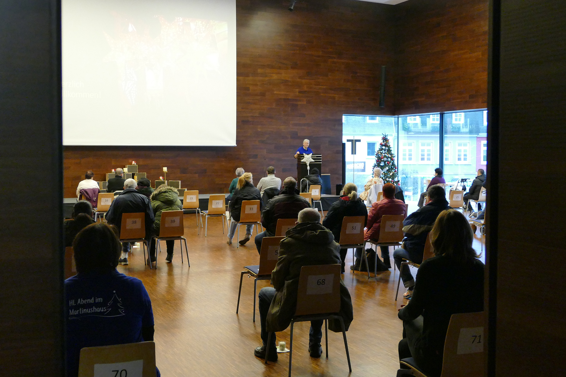 Wegen der Coronapandemie musste nun schon zum zweiten Mal die traditionelle Feier am Heiligen Abend auf mehrere kleine Gruppen am Wochenende vor dem Fest verteilt werden. Insgesamt rund 350 Menschen kamen zu Gottesdienst und Bescherung. Rektorin Dr. Ursula Silber feierte mit den Gruppen zu jeweils etwa 60 Personen eine Andacht, in der die Weihnachtsgeschichte in leicht verständlicher Sprache und mit Bildern erzählt wurde. Das Licht der Hoffnung wurde dabei an der Krippe entzündet und die Teilnehmer konnten es in einer weihnachtlich gestalteten Lichtertüte mit nach Hause nehmen. Beim Verlassen des Saals erhielten die Mitfeiernden zwei Tüten. In der einen war ein Weihnachtsessen mit Rindergulasch, Spagetti und Rotkraut zum selber Aufwärmen, in der anderen es kleine Geschenke und Gutscheine. Kinder erhielten eine Extratüte mit Spielsachen. In diesem Jahr gab es noch einen weiteren Programmpunkt. Der Aschaffenburger Arzt Dr. Robert Löwer hatte eine Impfaktion im Anschluss an den Gottesdienst organisiert. Rund 30 Personen nahmen dieses Angebot an, in den meisten Fällen für die Booster-Impfung. Die Feier, die Geschenk- und die Impfaktion wurde von Saskia Braun, der Koordinatorin des Projekts, gemeinsam mit 15 ehrenamtlichen Helfern organisiert.