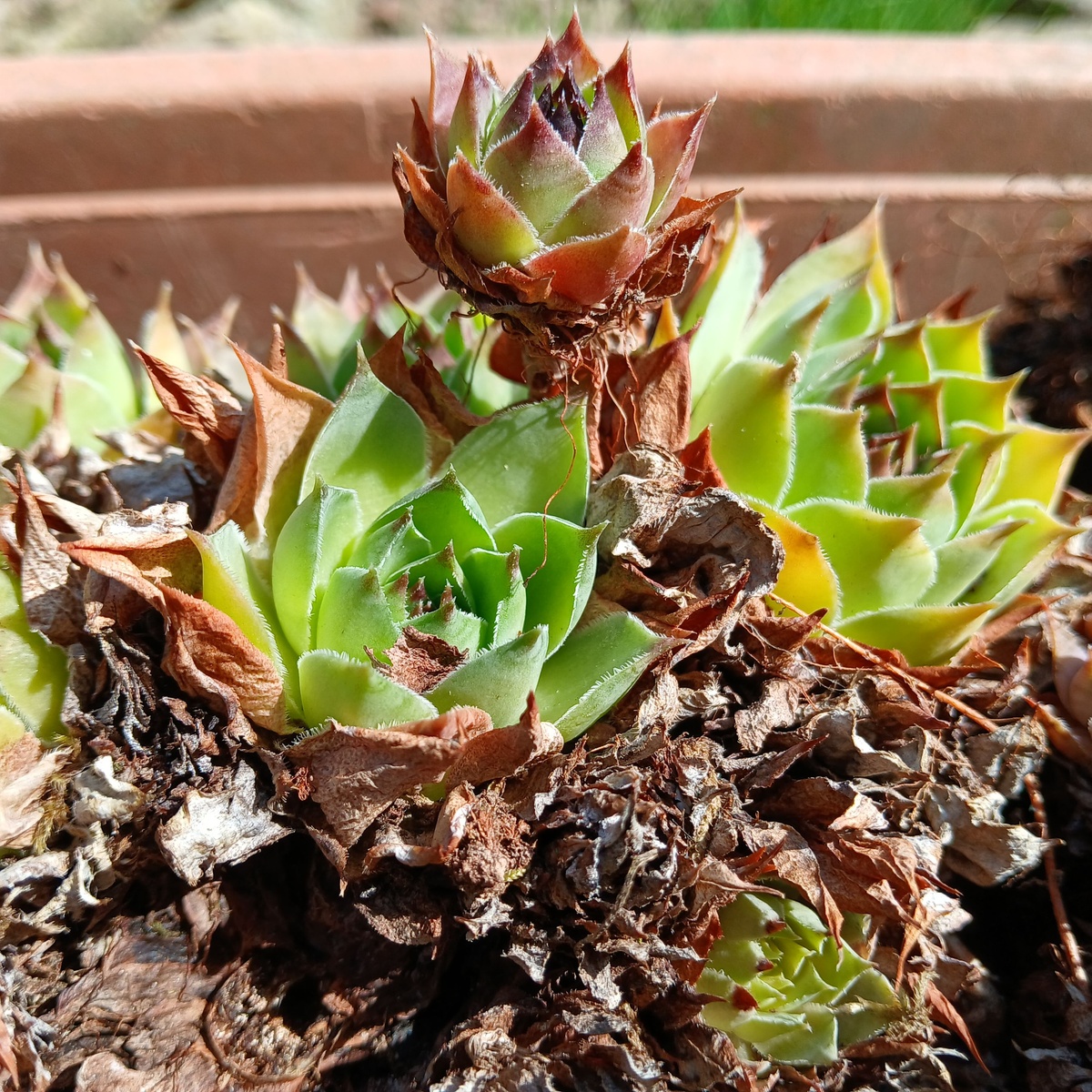 Am Fenster eines Nebengebäudes hatte ich einen Blumenkasten voller Hauswurz-Pflanzen. Die waren mir über lange Zeit ganz aus dem Blick geraten, hatten kein Wasser bekommen und so waren alle Blätter dieses sogenannten „Dickblattgewächses“ total trocken und braun geworden. Ich wollte sie schon entsorgen, habe aber dann entschieden, dass ich ihnen (und mir!) noch eine Chance geben will. Also habe ich sie gut gewässert und nach einigen Tagen fing es aus der trocken-braunen Masse wieder an zu grünen. ‚Sempervivum‘ ist der botanische Name dieser Pflanze – ‚Immer lebend‘.