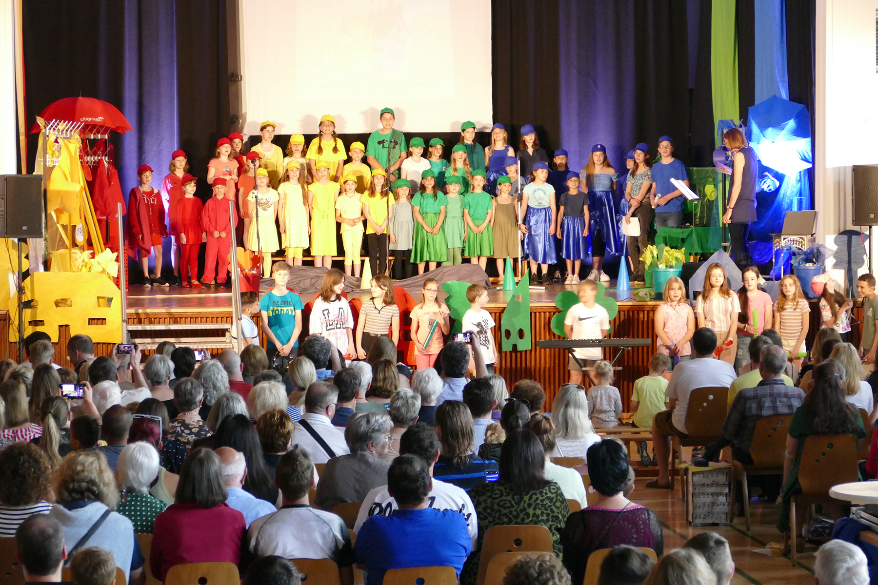 Eingeladen hatten der Kinder- und der Jugendchor der Pfarreiengemeinschaft „Am Schönbusch – Sankt Kilian – Sankt Laurentius, Aschaffenburg“ anlässlich des 100. Jubiläums der Pfarrei Sankt Laurentius im Aschaffenburger Stadtteil Leider. Mehr als 200 Zuschauer ließen sich von der Geschichte von Gina Ruck-Pauquét begeistern. Rund 35 Sängerinnen und Sänger hatten das Stück mit Chorleiterin Christiane Michaeli eingeübt. Sie spielten die Geschichte von einem Land, in dessen vier Vierteln jeweils nur eine Farbe erlaubt ist. Das ist zwar einerseits sehr ordentlich, aber schnell auch sehr langweilig. Wenn man im grünen Viertel immer nur Kaktushüpfen spielen kann, im roten Viertel nur Tomaten in den Sonnenuntergang wirft, im gelben Viertel immer den Bananenbumerang fängt und im blauen Land nur Blaubeeren sammelt, dann macht das auf Dauer unzufrieden. So durchbrechen die Kinder irgendwann dieses Einerlei und fangen an, bunt zu werden. Das Stück ist ein Plädoyer für mehr Vielfalt und Offenheit für den, der anders ist. Die Kinder spielten und sangen sichtlich begeistert zur fetzigen Musik. Gemeinsam mit Marcia de Rezende Walter und Luciane Gebhard hatten sie auch einige Tänze für das Musical eingeübt. Überhaupt war im Hintergrund noch einiges an Unterstützung notwendig, damit das Stück so über die Bühne gehen konnte. Kräftiger Applaus und bunte Blumensträuße waren die Belohnung für die kleinen und großen Künstler. Am Ende wurden noch Spenden gesammelt für die Projekte des Sternsingerwerks und ein Projekt in der Sahel-Zone.