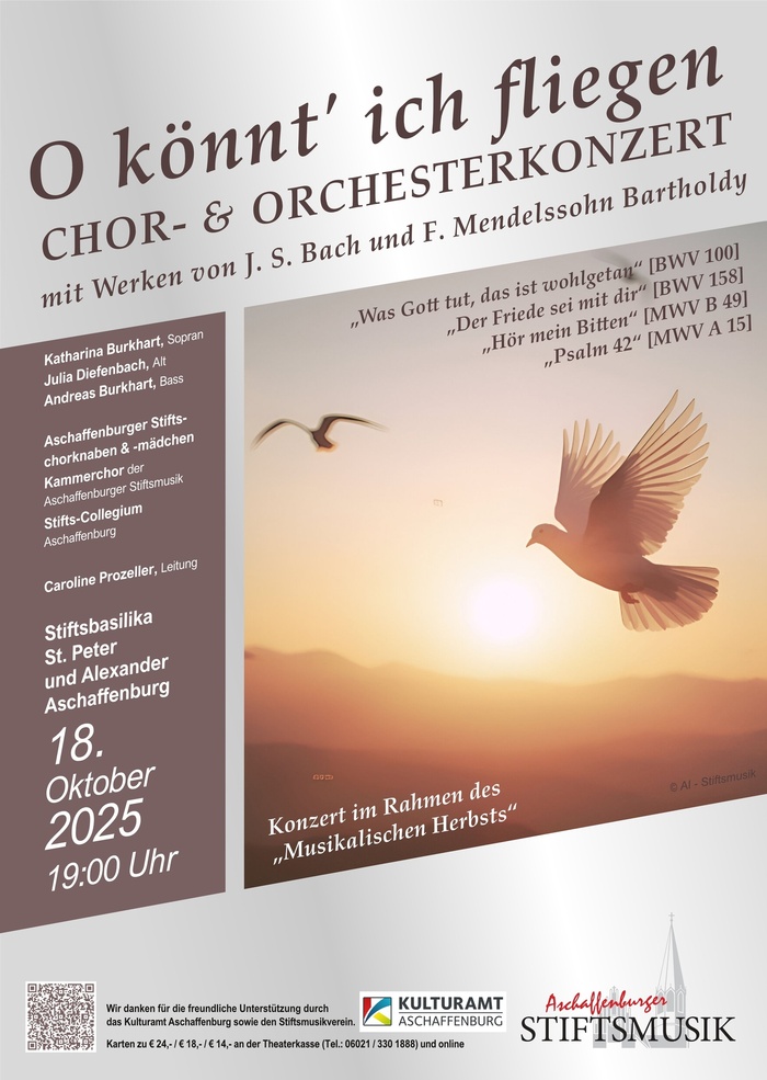 Ob die Aufführenden nun 10 oder 60 Jahre alt sind – die Tragkraft der Musik lässt uns abheben und schweben. Im Konzert „O könnt' ich fliegen“ zeigen vier unterschiedliche Stücke – zwei aus der Barockzeit, zwei aus der Romantik – wie verschieden doch die Strömungen und Bewegungen sein können: mal laut, mal leise, mal forsch, mal sanft, immer aber einfangend und mitreißend. Auf diese Reise möchten die Stiftschorknaben & -mädchen, der Kammerchor, die Solisten und das Orchester die Zuhörer mitnehmen und mitfliegen lassen.